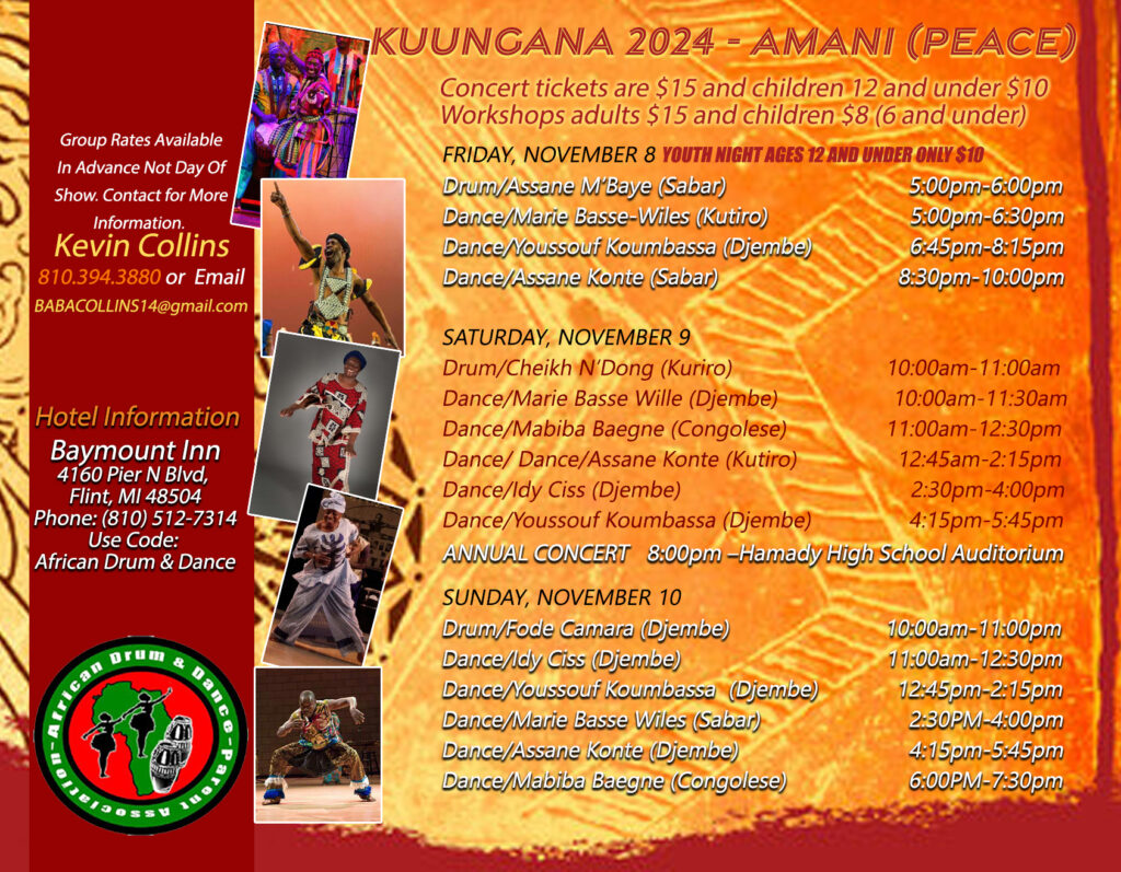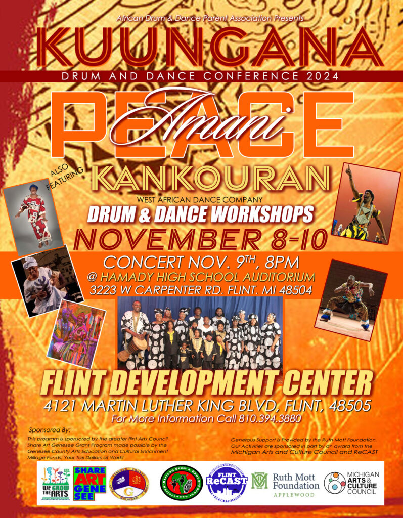 To expose Flint area youth and adults to West African artists and cultural traditions that encourage self-awareness, youth leadership, and community pride.